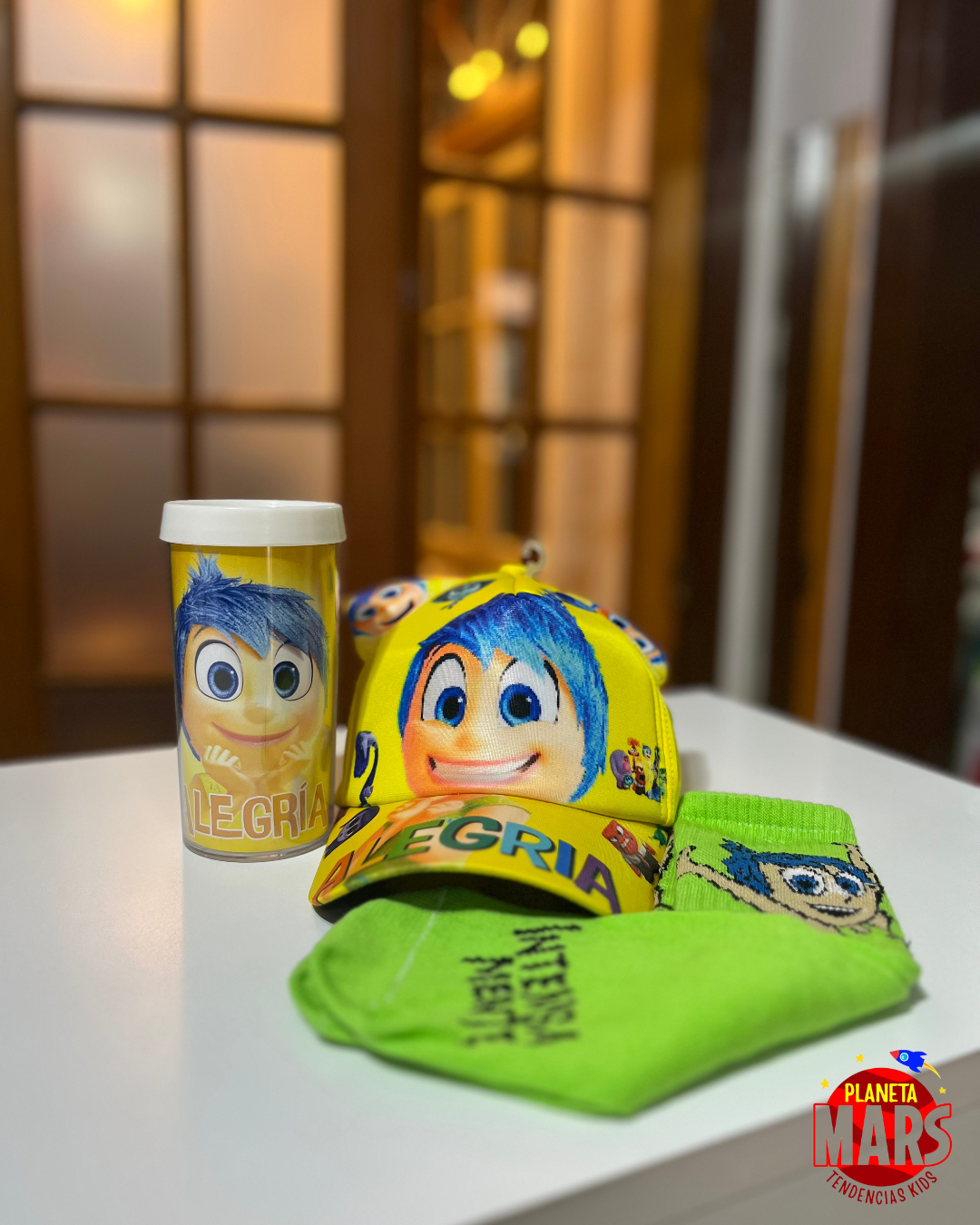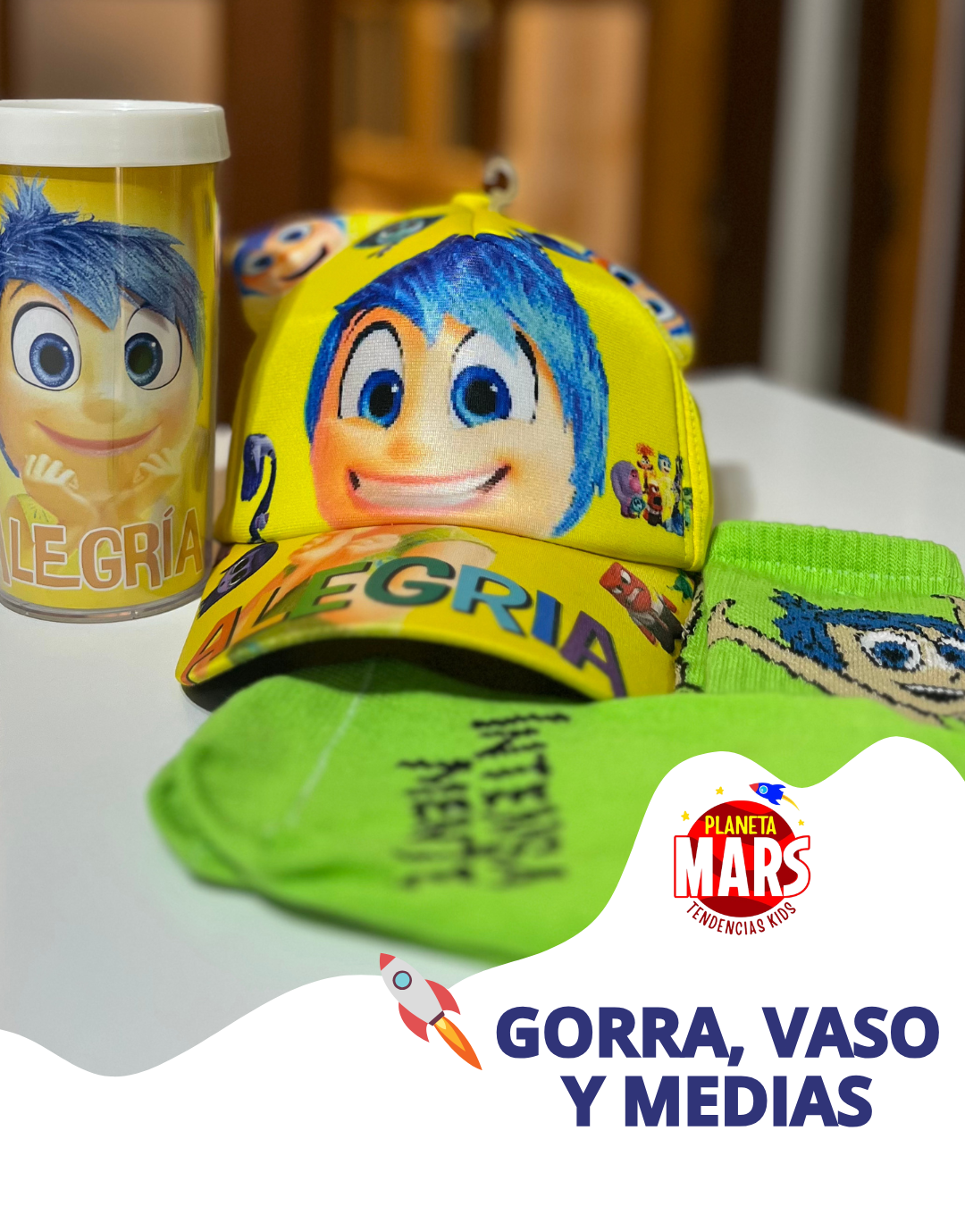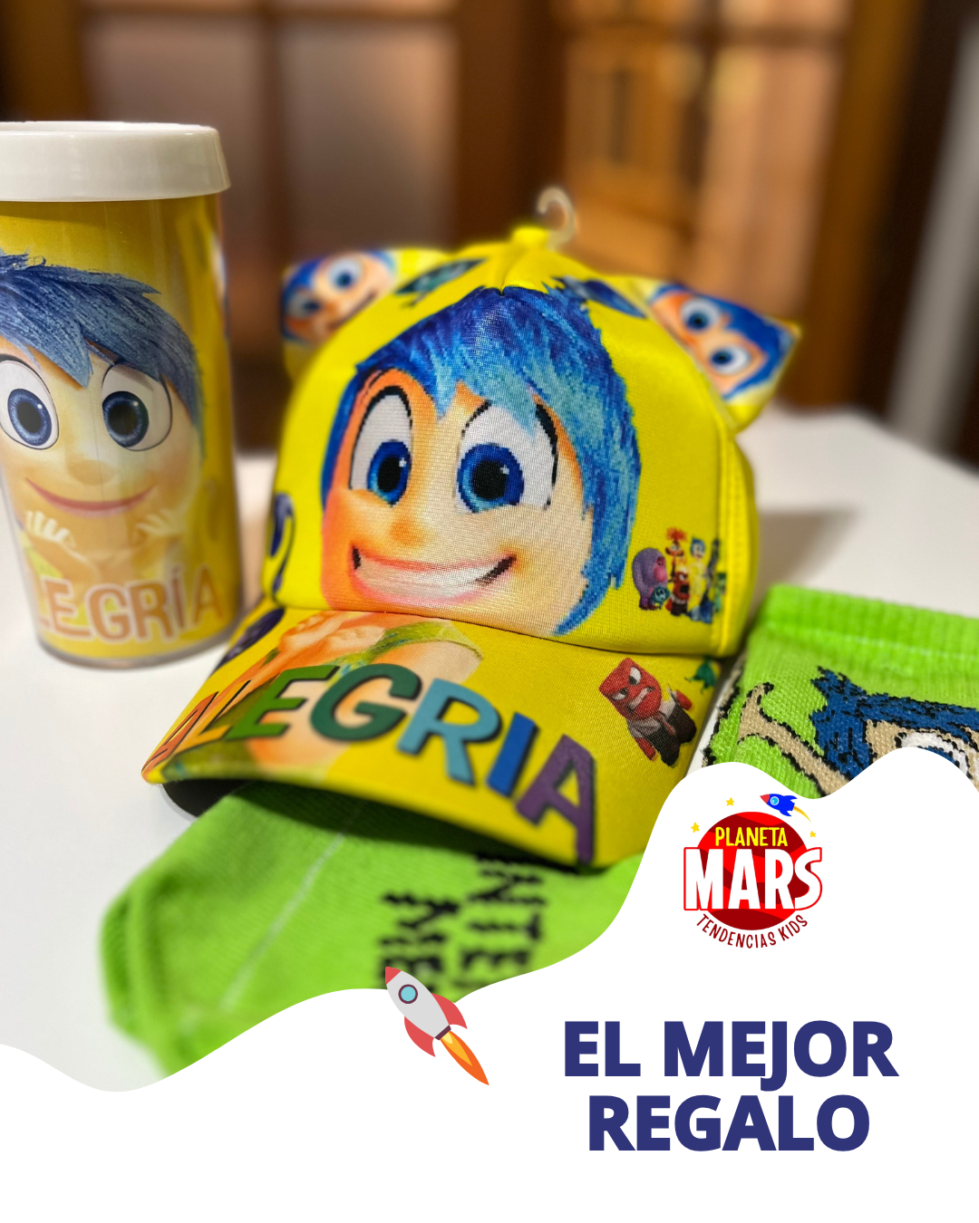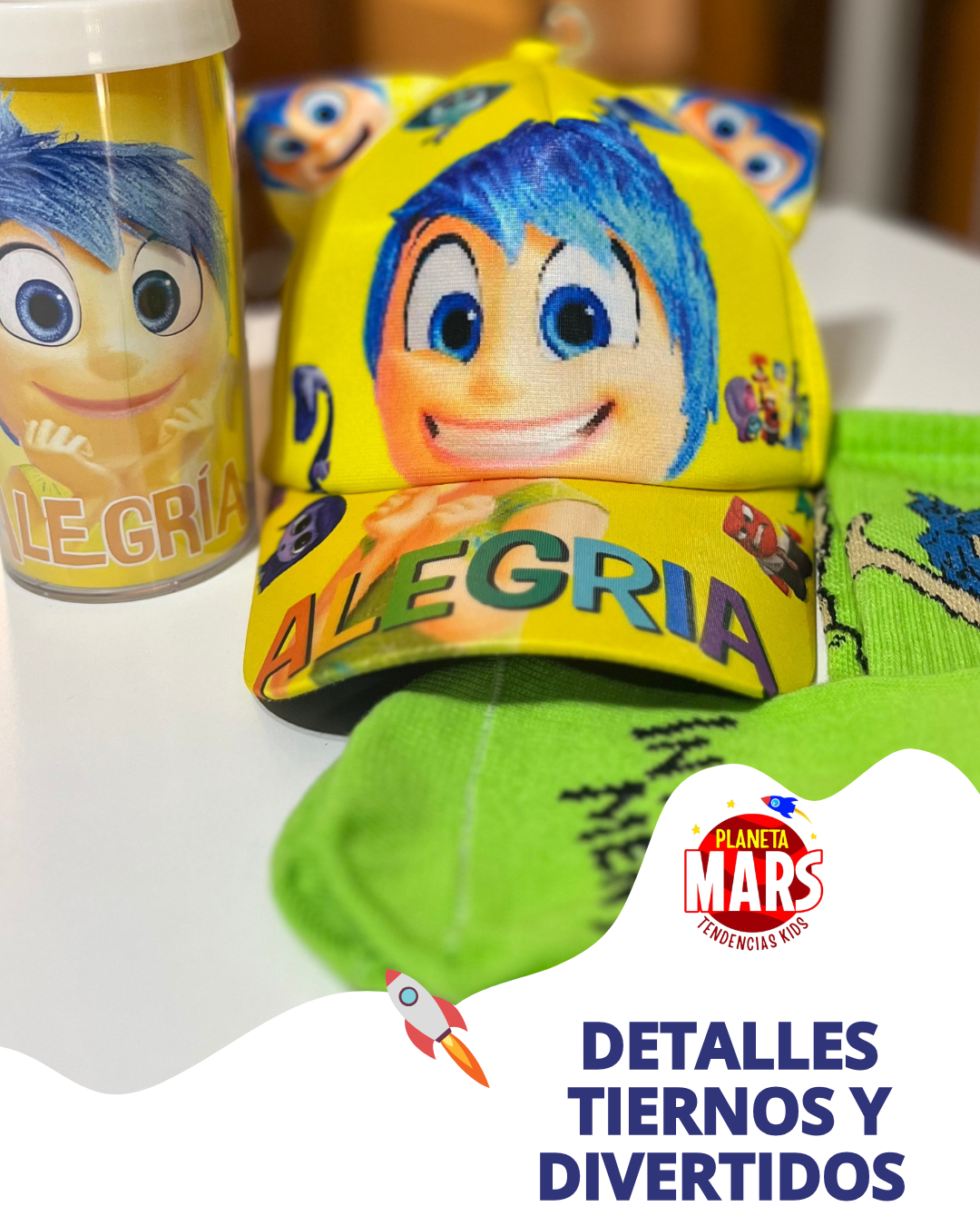 Esta gorra de Intensamente con orejitas no solo protege del sol, ¡también es un festival de emociones en la cabeza! Perfecta para niños y niñas con mucha imaginación. (Gorra sublimado con coronita. Regulable. Para 2 a 6 años aprox.)