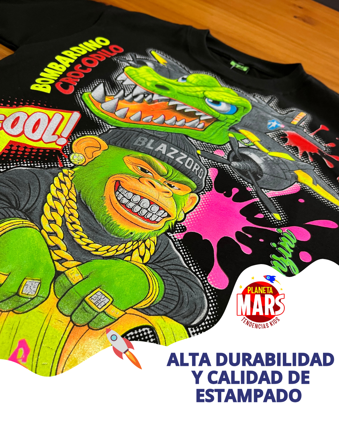 Esta remera de Italian Brainrot es ideal para que tu peque juegue, se divierta y lleve el chiste a donde vaya. Y cuando se pagan las luces ¡ El diseño brilla en la oscuridad!