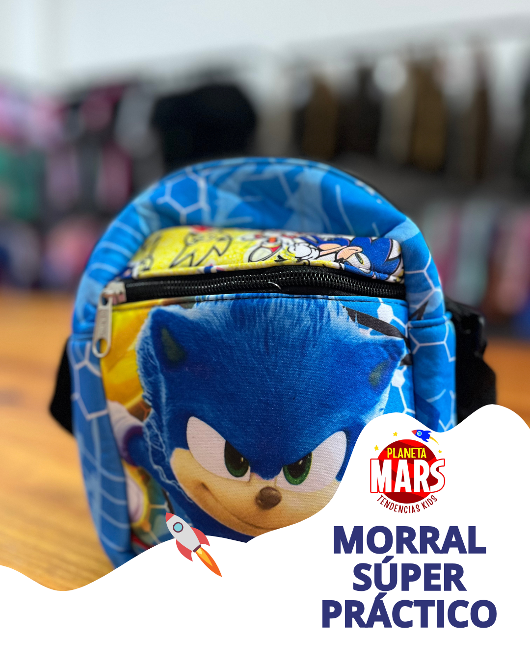 Bolso Morral de neoprene sublimado de Sonic mide 15 cm de ancho x 20 cm de alto x 9 cm de profundidad. Tiene un compartimiento principal y un bolsillo delantero.