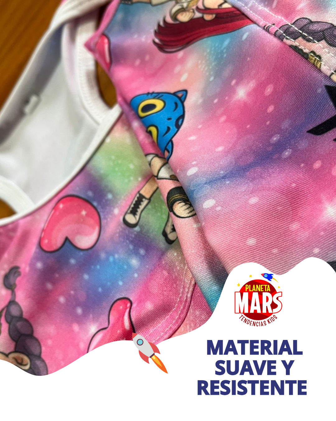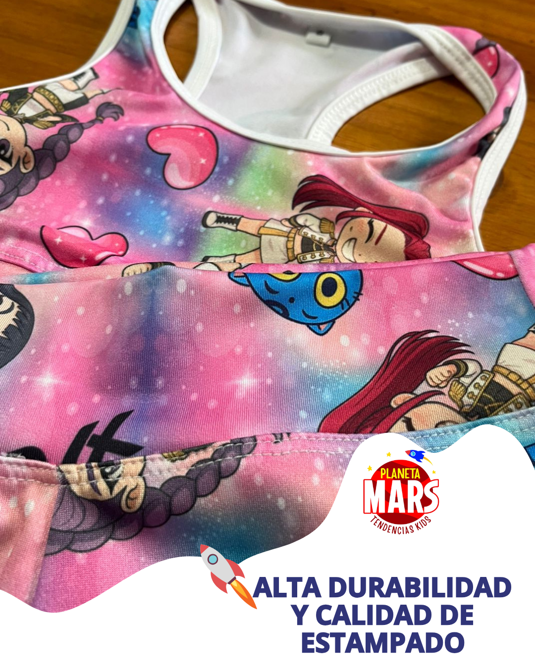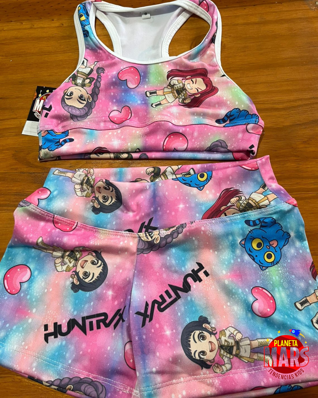 ¡Preparate para jugar, saltar y brillar con tus personajes favoritos de Las Guerreras Kpop! Este conjunto de lycra es suave, cómodo y lleno de color, perfecto para moverse con alegría todo el día.