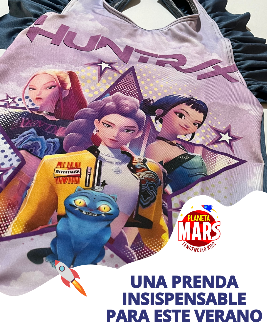 Para las peques que aman la música, el brillo y el estilo. Con estampa full color de las Guerreras K-Pop, súper cómoda y resistente para usar en pile, río o mar.