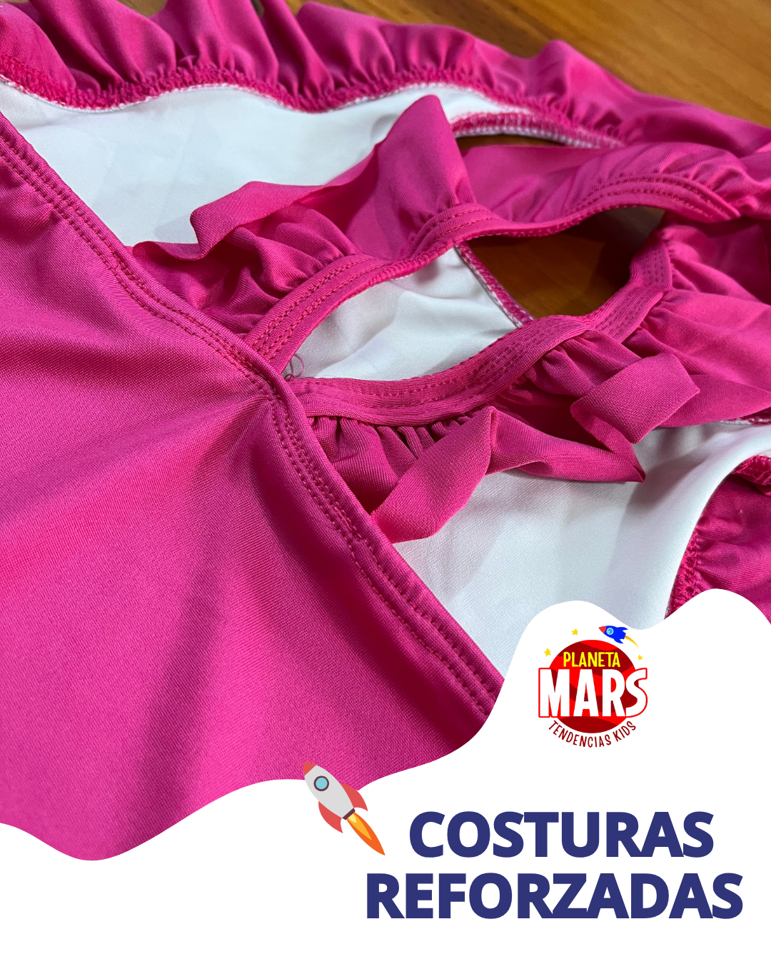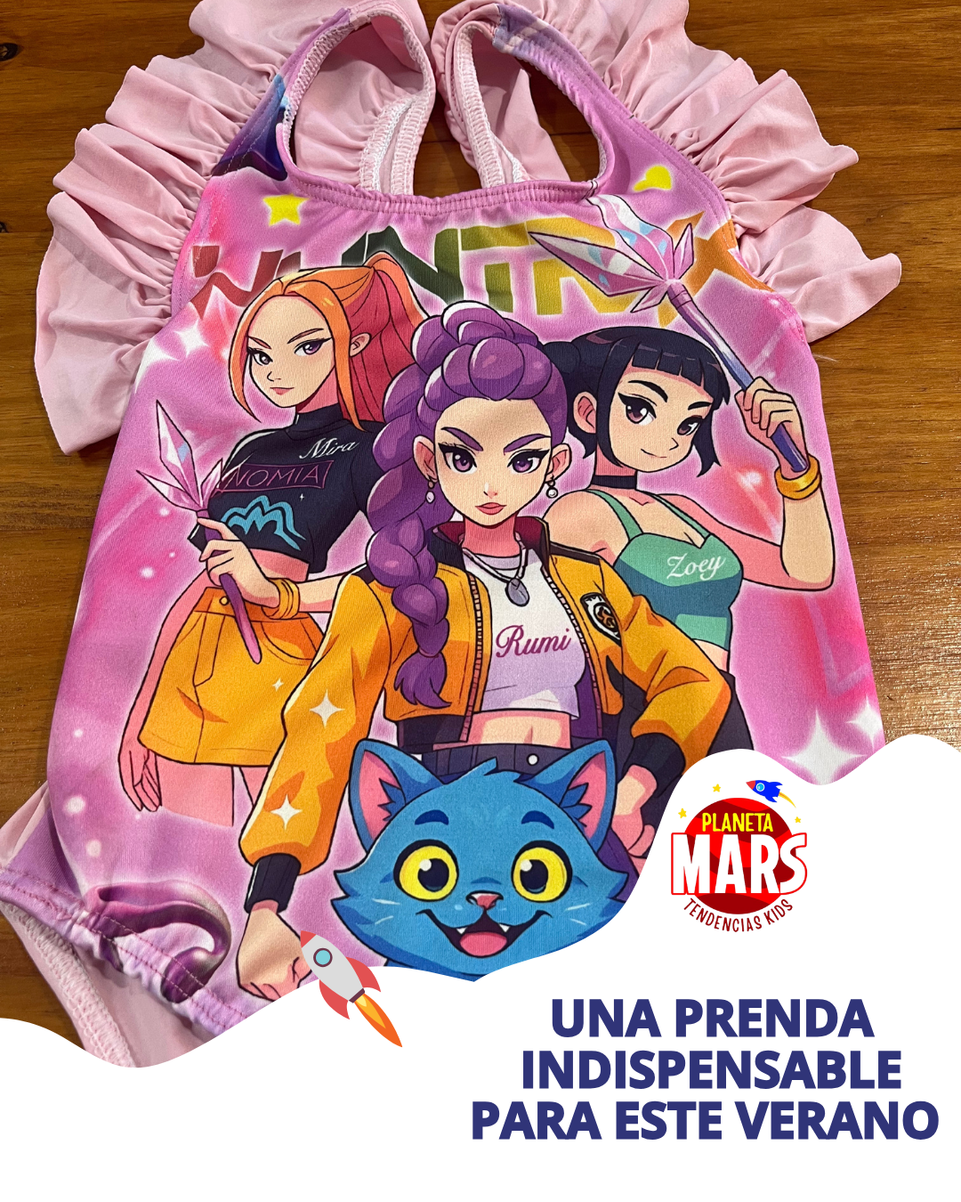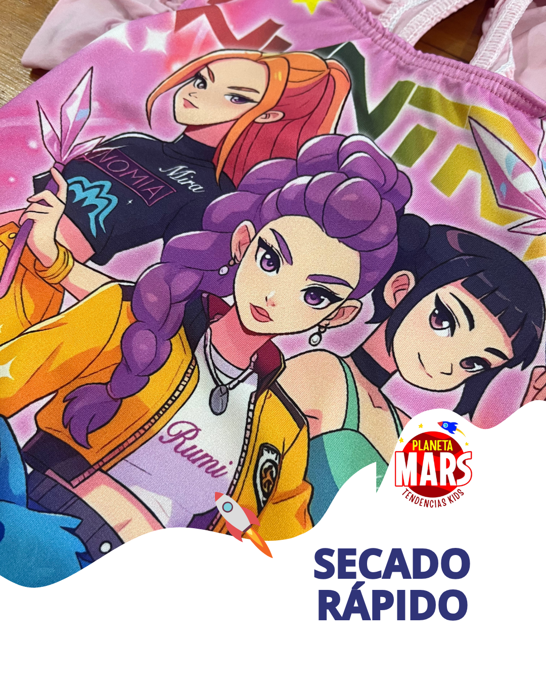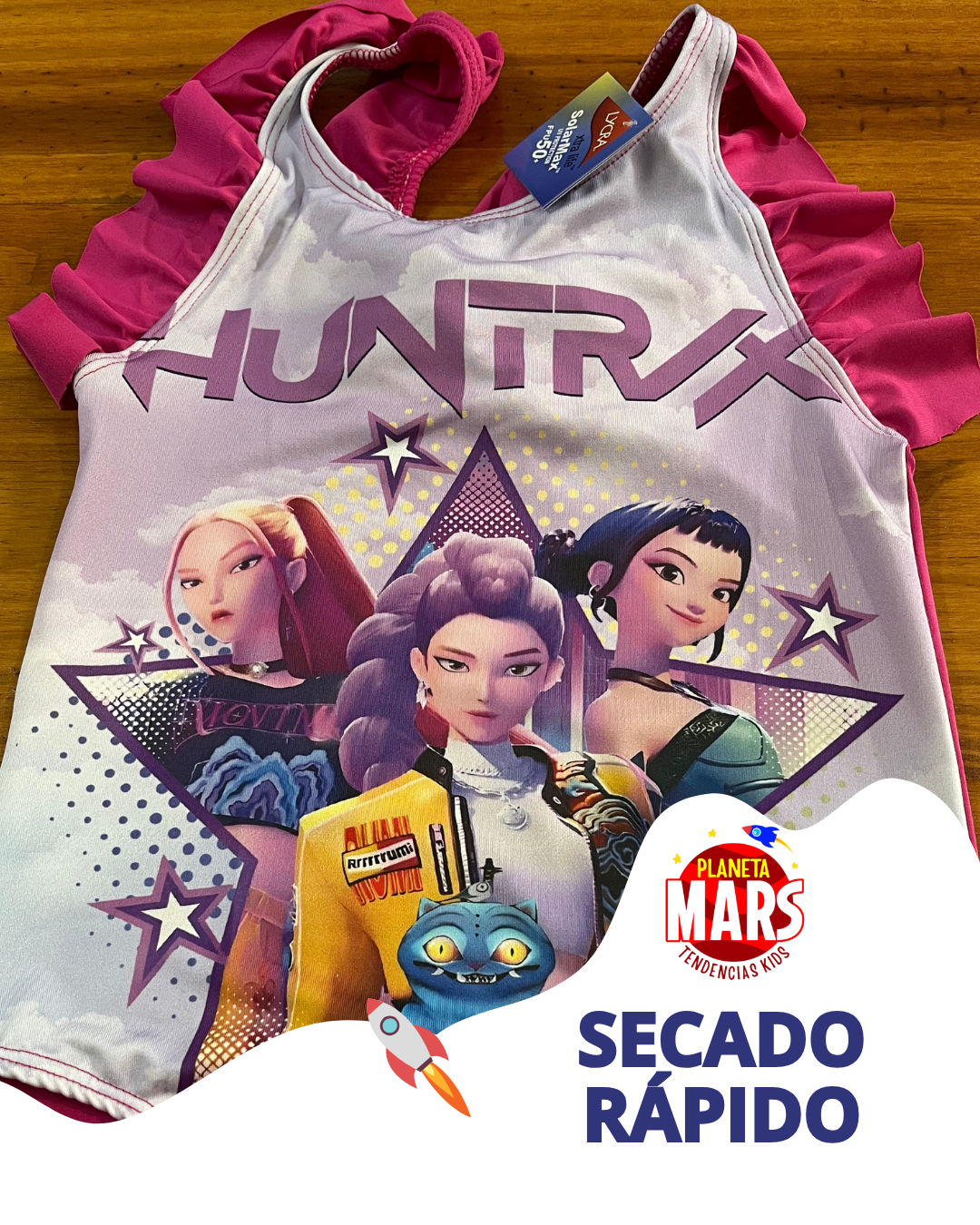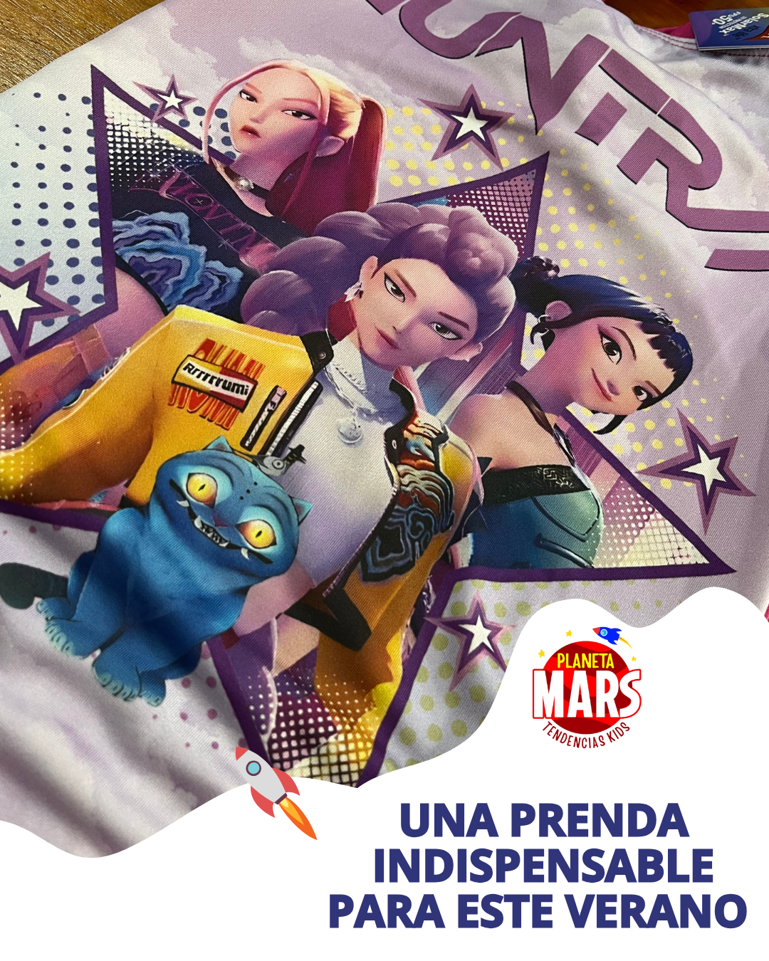 Para las peques que aman la música, el brillo y el estilo. Con estampa full color de las Guerreras K-Pop, súper cómoda y resistente para usar en pile, río o mar.