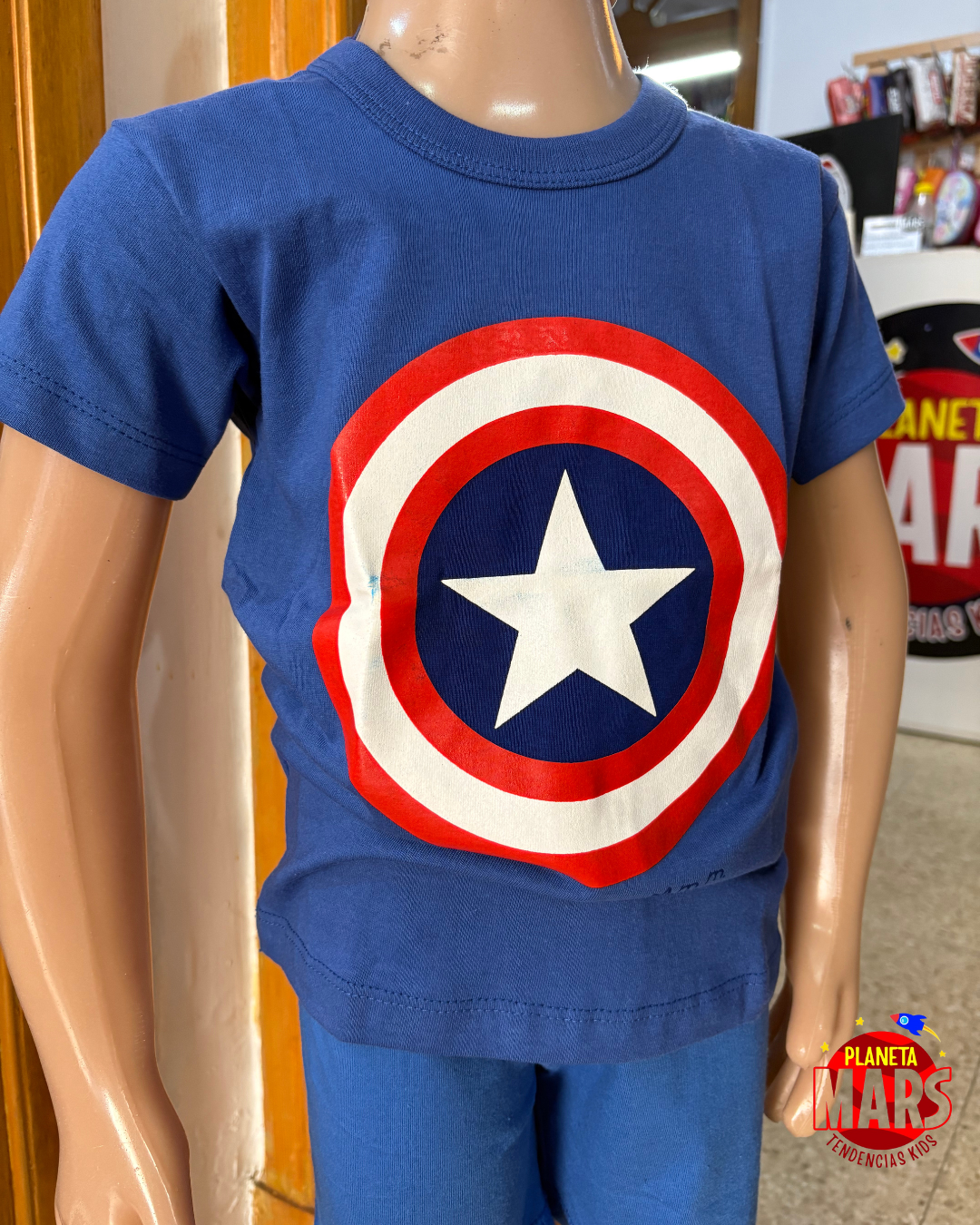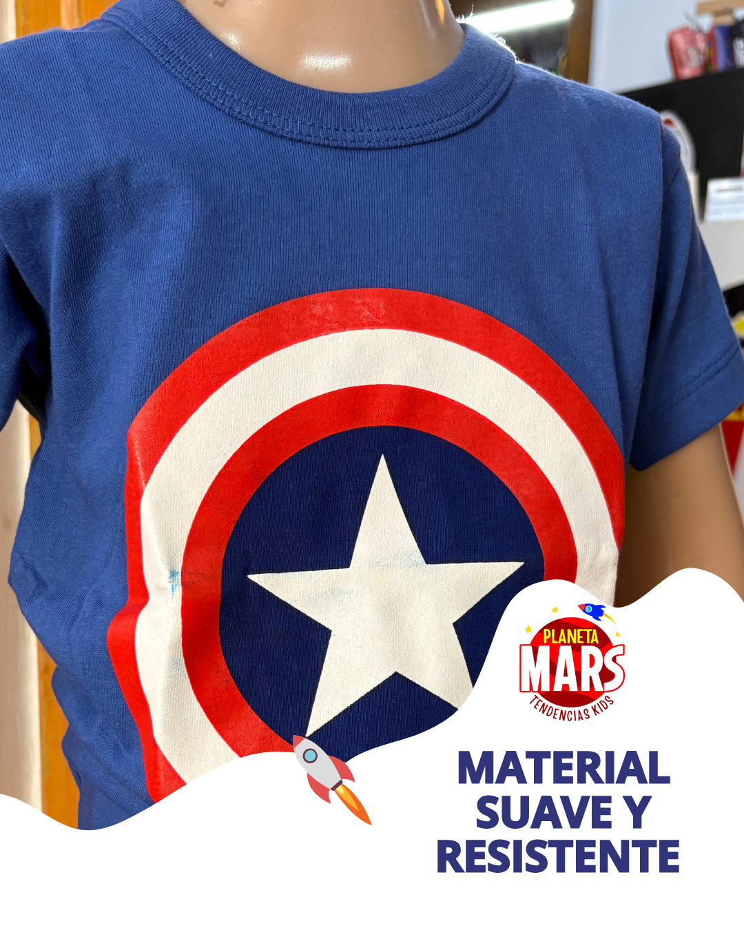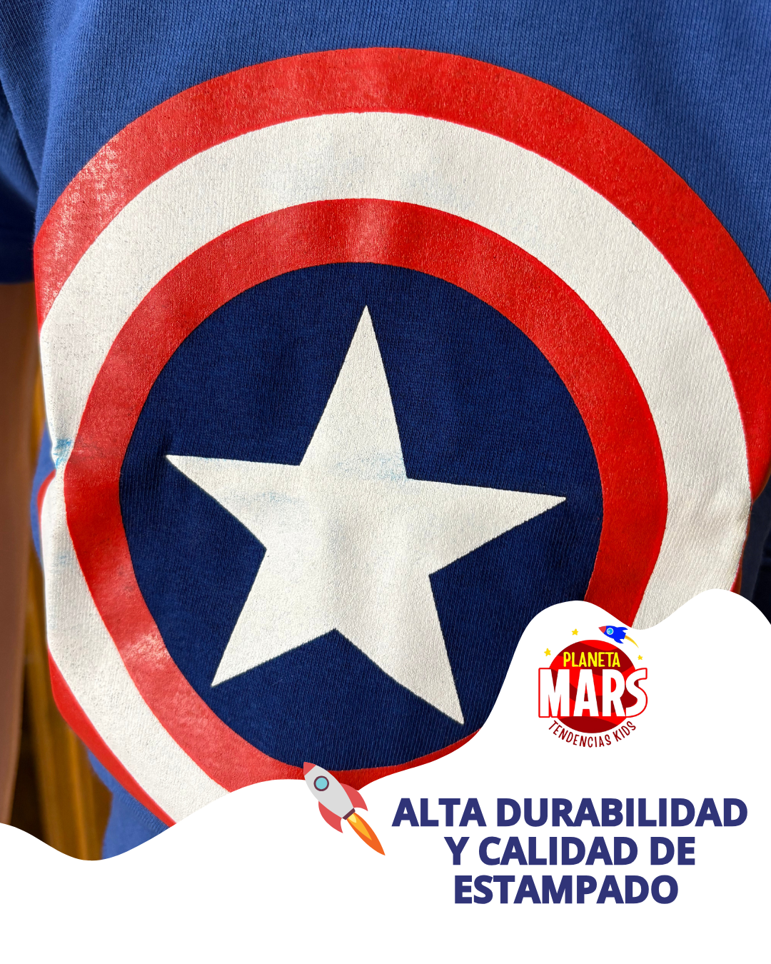 ¡Tu peque está listo para liderar la aventura con esta remera del Capitán América súper cómoda, resistente y con el icónico escudo en frente, es ideal para jugar, correr y defender la justicia. ¡Estilo de superhéroe activado para todos los días!